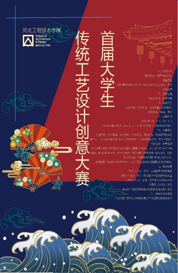 河北工程技术学院建筑与设计学院首届大学生传统工艺设计创意大赛于2022年4月创办,大赛以传统工艺、创意为核心,深度挖掘、选拔富有优秀创意的工艺产品、设计作品、手绘作品。鼓励广大学生,守正创新,弘扬社会主义核心价值观,搭建优质交流平台。为提高学生学习兴趣,加强学风建设,打造专业特色,提高教育教学质量。