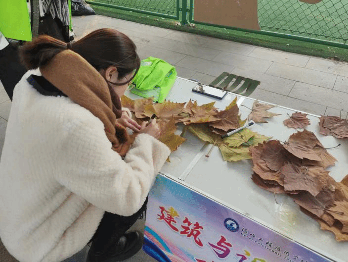 落叶,这是大自然给我们的一份独特的馈赠,也是引导人们真切感受秋天的美好、亲近自然、探索自然奥秘的大好时机。为了激发大家对季节变化的探索欲望,让大家与大自然亲密接触,丰富其社会经验,河北工程技术学院暨建筑与设计学院2023年11月23日开展了首届落叶创意文化节,在建筑与设计学院社团联合会的组织的策划下,形态各异的落叶在17组参赛人员的设计和装饰下,变成了创意无限的作品,引得过路同学纷纷打卡,吸引人们的目光,传递出对于自然环境和生活的美好向往和热爱。进入霜降节气后,深秋景象明显,冷空气南下越来越频繁。