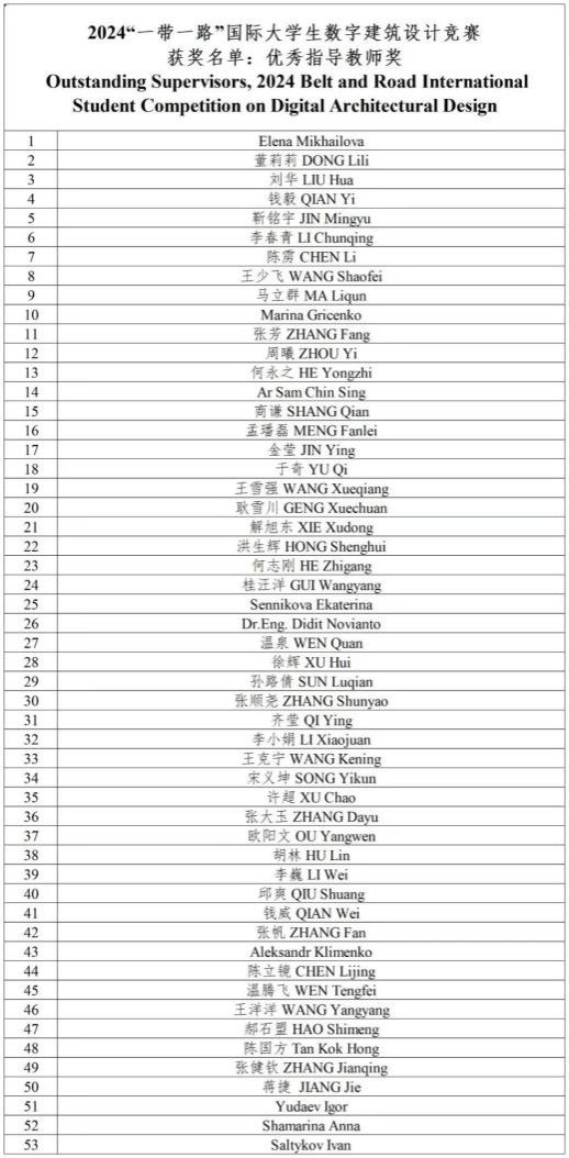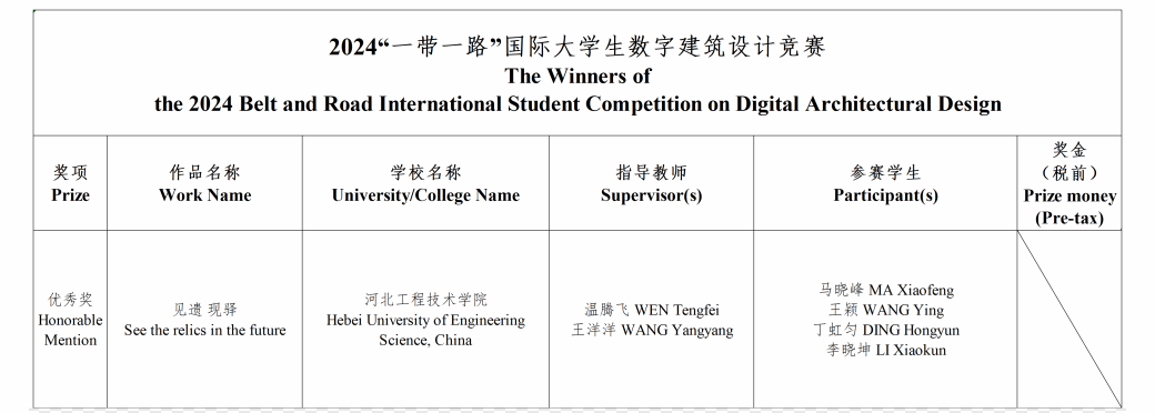 由“一带一路”建筑类大学国际联盟(BRAUIC)发起,北京建筑大学主办、丝路国际公益基金等单位协办、联合国教科文组织等单位支持的2024“一带一路”国际大学生数字建筑设计竞赛获奖名单公布,今年会荣获优秀组织奖。此次赛事中,我院共组织12名学生,4位指导教师参与此次竞赛,其中马晓峰、王颖、丁虹匀、李晓坤学生团队参赛作品《见遗 现驿》荣获数字化建筑设计方向优秀奖,指导教师温腾飞、王洋洋荣获优秀指导教师奖。