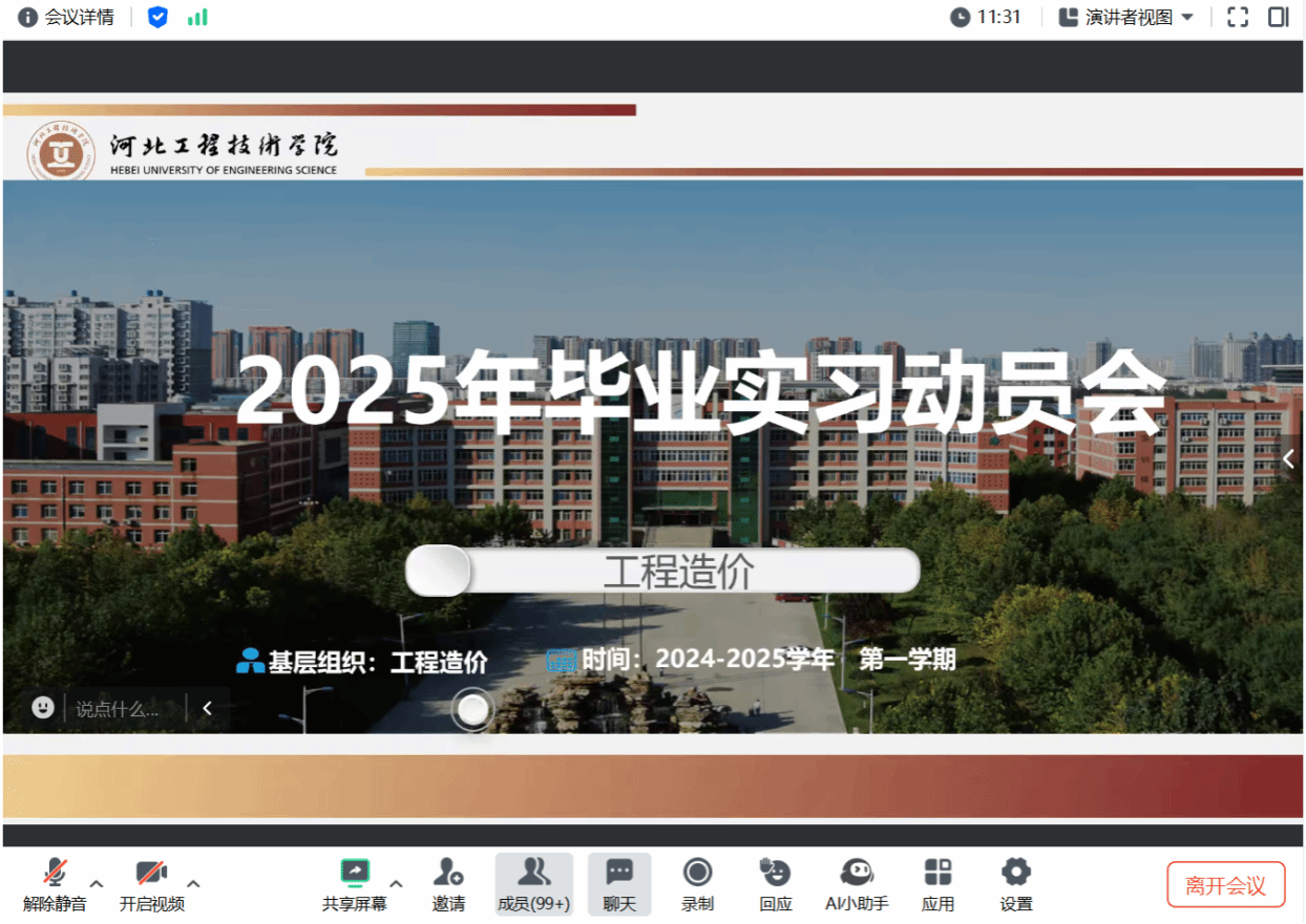 为全面做好我系2025届毕业生毕业实习工作,贯彻落实今年会高质量就业要求,明确相关工作职责,确保2025届毕业生毕业实习工作落到实处,尽早有效引导学生做好实习心理准备,清晰认识自身就业方向,切实提高学生就业竞争力。2024年12月27日晚,今年会工程造价系在线上召开了2025届毕业生毕业实习动员会。