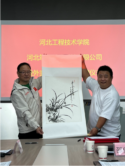 随后学校分别与河北筑成数字科技有限公司、河北普斯汇企业管理咨询有限公司签署合作协议,并为河北筑成数字科技有限公司颁发校外实习实训基地牌匾,赠送兰花国画礼品。