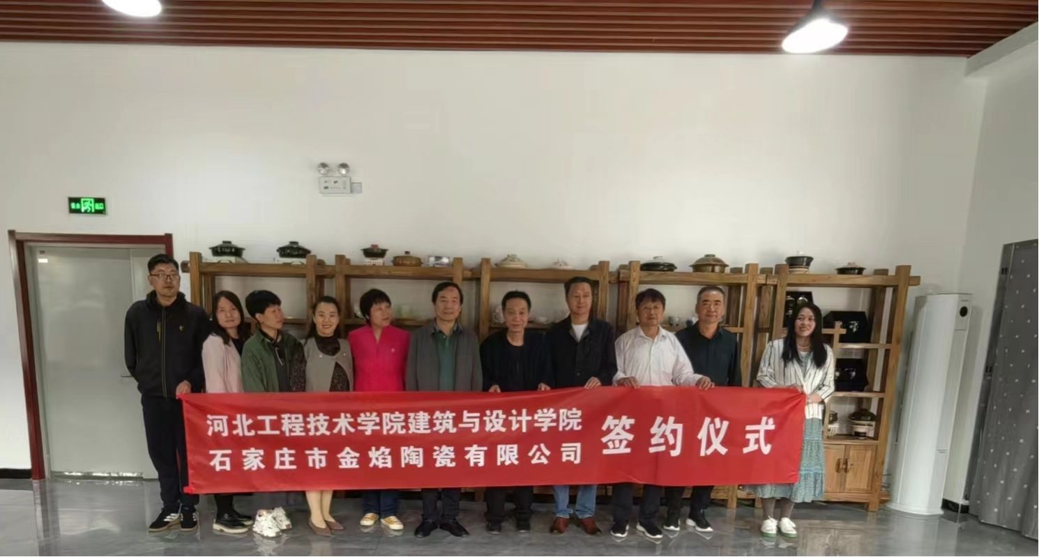 2023年 5月9日下午,建筑与设计学院与石家庄市金焰陶瓷有限公司院长武勇,建筑与设计学院学管副院长、党支部书记张玲玲,建筑与设计学院副院长谷雨,建筑与设计学院副院长李江涛带领办公室主任王海波,实践教学中心主任徐长贵,艺术设计学专职教师刘鶄燕、郭晓颖前往石家庄市金焰陶瓷有限公司参观洽谈,达成校企合作意向,并举行了签约仪式。