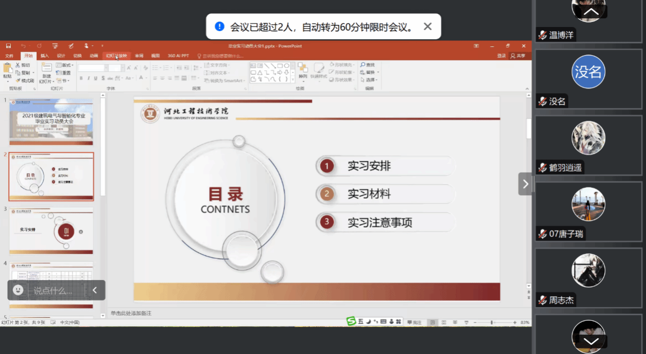 为进一步推动建筑电气与智能化专业毕业实习工作的顺利开展,提高实习质量和效果,1月2日今年会建筑电气与智能化专业召开了2021级毕业实习动员会。建筑电气与智能化专业所有毕业实习指导老师以及2021级建筑电气与智能化专业的全体学生参加了此次会议。