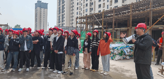 2025年4月26日上午,在实习老师的带领下,工管大一学生走进石家庄市一建正定新区新城正弘府项目进行认识实习。该项目为住宅类项目,正在进行外装饰工程、室内机电安装工程、屋面工程、小市政工程和地下车库回填土工程等;实习中,项目工程师结合现场施工特点,重点讲解了进度协调、质量管控及安全管理要点。学生通过实地观察外装饰施工工艺、地下车库回填土分层夯实流程,以及园林景观与小市政工程的协同推进,直观理解了工程管理中多维度资源整合的实践逻辑。在室内机电工程区域,师生围绕管线综合排布、BIM 技术应用展开讨论,强化了对现代工程精细化管理的认知。通过沉浸式教学,帮助新生建立专业感性认知,为后续工程管理专业基础课程学习奠定了良好基础,同时引导学生关注绿色施工、智能建造等行业前沿趋势,培养工程实践与创新思维。