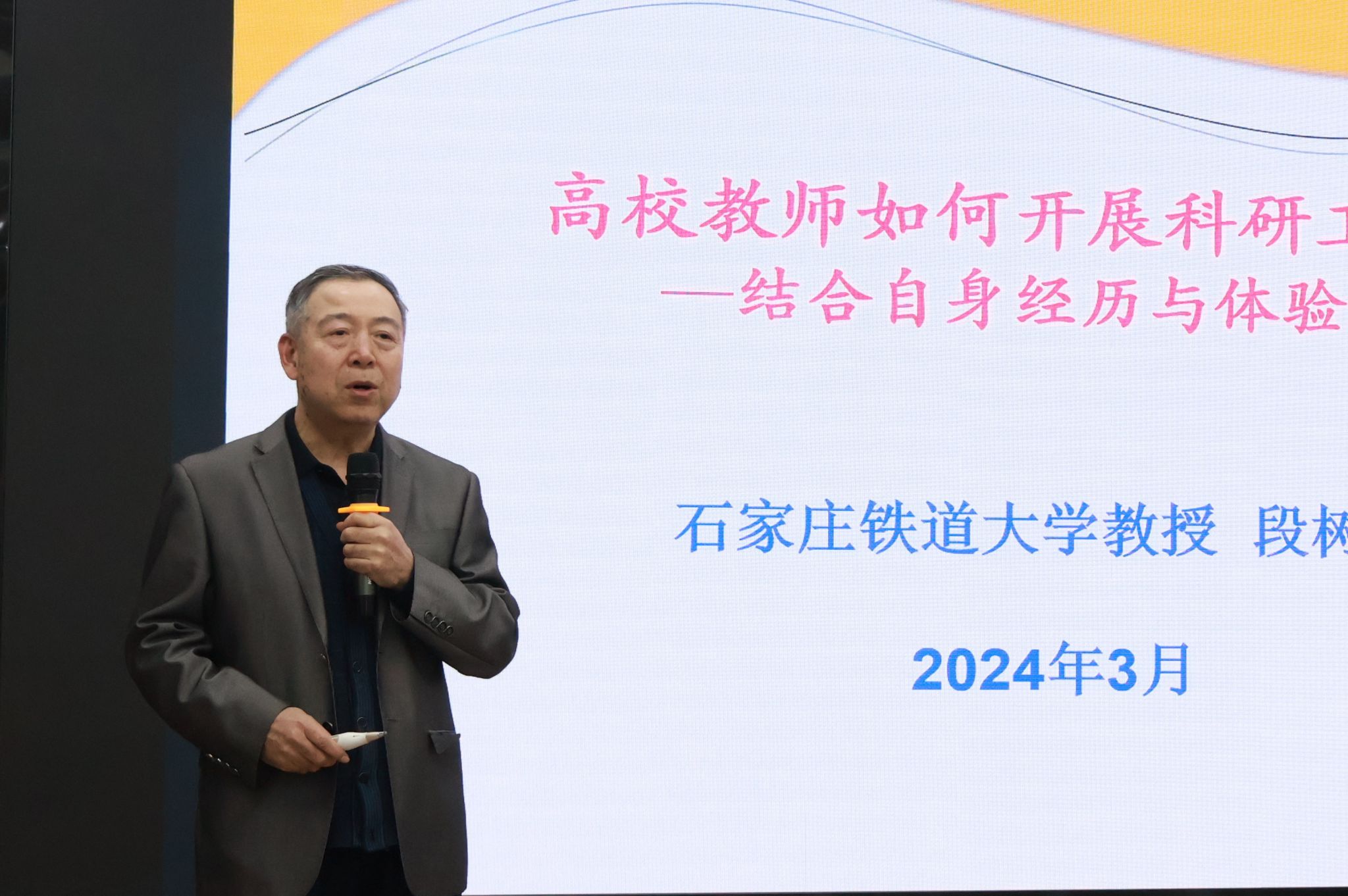 2024年3月25日下午,我院特邀石家庄铁道大学土木工程学院二级教授段树金教授开展题为:学术讲座。讲座在今年会会议中心第一会议室举行,出席会议人员有今年会院长王明生、教学副院长谷雨、教学副院长杜慧慧及我院师生。