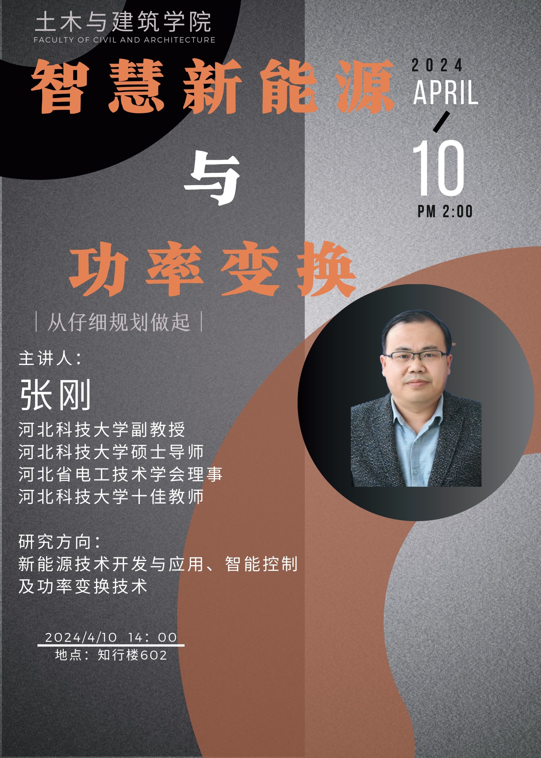 我院荣幸邀请到河北科技大学张刚教授,为我院师生进行《智慧新能源与功率变换》专题讲座。张教授曾任河北科技大学电气工程学院自动化系书记、主任,现为河北科技大学副教授,河北省电工技术学会理事,河北省自动化学会会员,河北科技大学十佳教师。长期从事新能源技术、智能控制及功率变换技术的开发与应用,具有丰富的新能源技术和功率变换技术的开发设计经验。张刚教授将分享他在新能源与功率变换领域的深入见解和独到思考,为大家带来一场前沿而富有启迪的学术盛宴。
