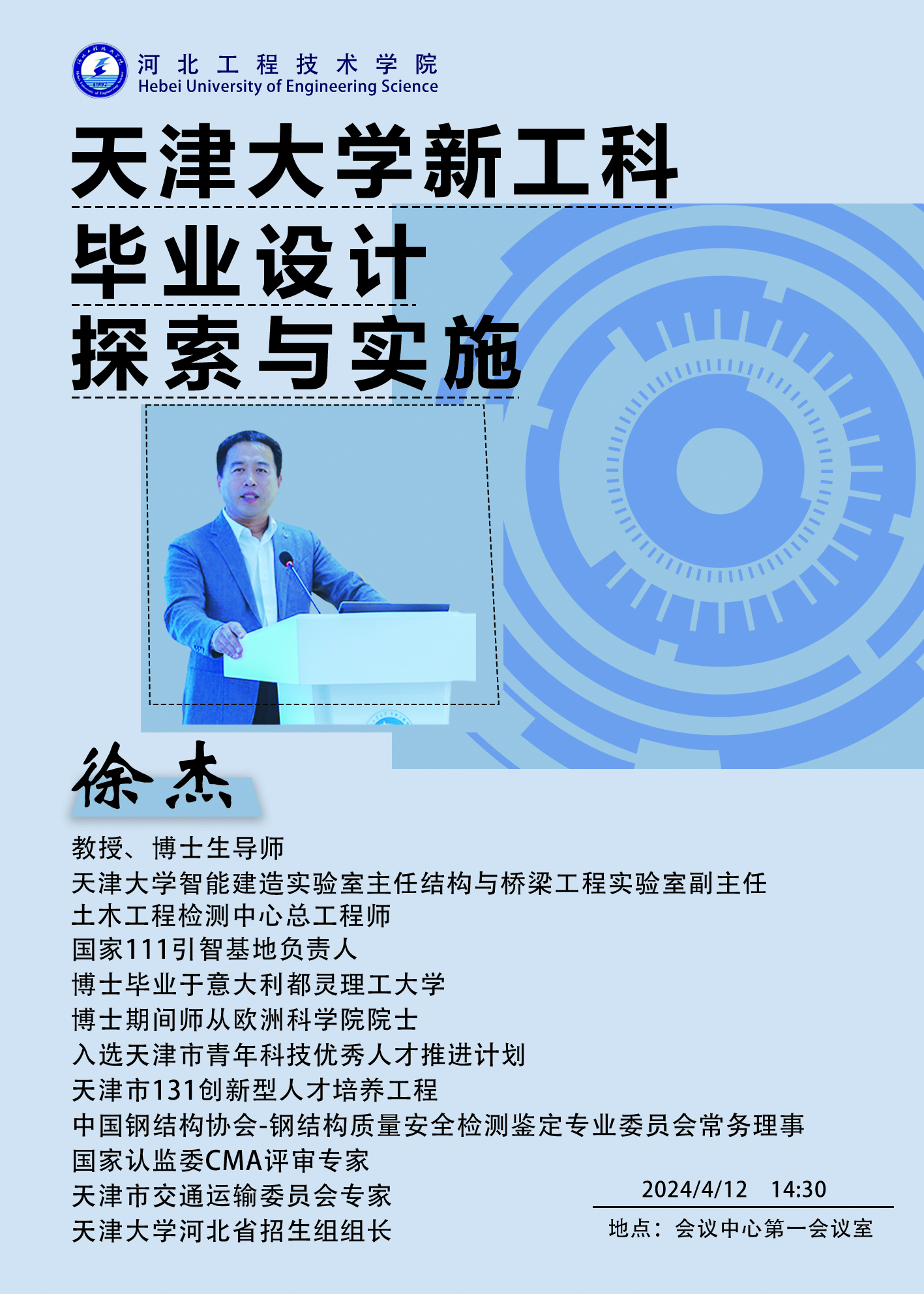主讲人简介:徐杰,教授、博士生导师。天津大学智能建造实验室主任、结构与桥梁工程实验室副主任、土木工程检测中心总工程师,国家111引智基地负责人。博士毕业于意大利都灵理工大学,博士期间师从欧洲科学院院士、第13届国际断裂力学学会主席Alberto Carpinteri教授,于2013年3月被天津大学引进回国。入选天津市青年科技优秀人才推进计划、天津市131创新型人才培养工程。中国钢结构协会-钢结构质量安全检测鉴定专业委员会常务理事、国家认监委CMA评审专家、天津市交通运输委员会专家,天津大学河北省招生组组长。长期从事智能建造新技术、结构智能监测及低碳绿色高性能材料方向研究。近年来主持及省部级国家级科研项目12项,重点工程委托项目20余项;发表高水平SCI论文60余篇,撰写英文著作2部及参编1部;获国际授权发明专利3项,国内发明专利7项,实用新型专利20余项,软件著作权6项,开发监测系统1套;在多个国内外学术组织兼职,是美国土木工程学会(ASCE)会员、美国科技学会(AASCIT)会员、国际建筑工程与土木工程会议(AECE2016)学术委员会委员、第14届国际断裂力学大会(ICF14)学术委员会委员;担任国际期刊Frontiers in Materials、Big Data and Cloud Innovation和Journal of Computer Science Research编委,国际期刊Applied Science、Sensor特邀编委;Construction and Building Materials、Structural Health Monitoring等10多个重要SCI期刊审稿人。