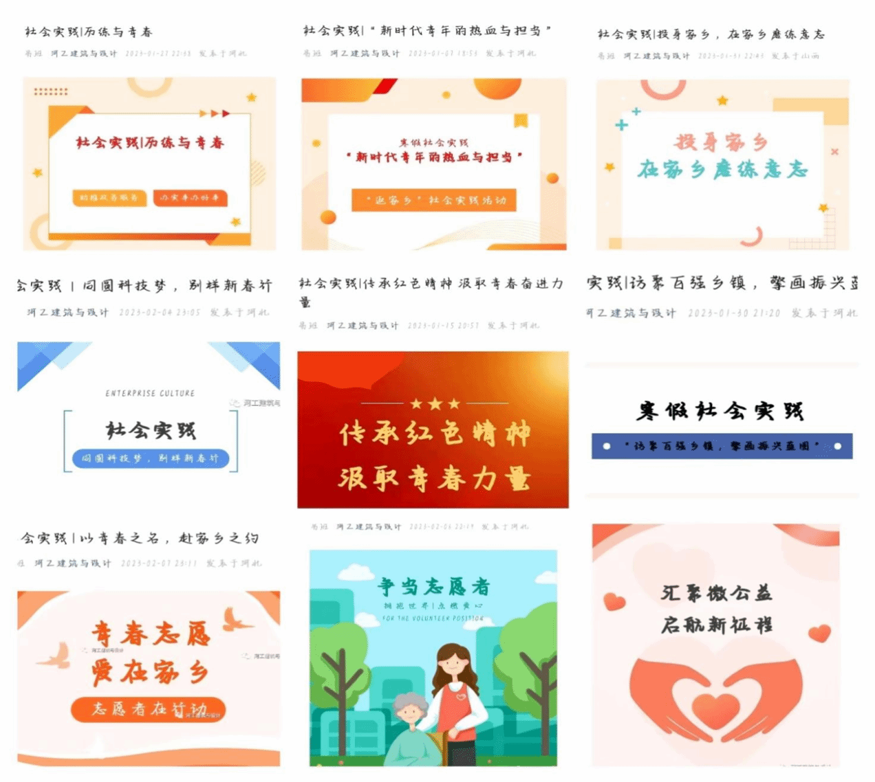 通过社会实践,引导大学生更好地感知社会、热爱家乡、服务群众,紧跟党走与人民群众相结合的成才道路,最终成功以简报的形式来提交。共有1470名同学,30余个小团体参加此次活动,共收到简报74份,同时公众号也发表数篇文章,其中建筑与设计共发表25篇文章,河工小团子共发表10篇文章,河北工程技术学院微平台发布1篇文章。“千里之行,始于足下”,让大学生们正确认识自己,作为新时代青年,我们更应该担当复兴重任,不负韶华、不负时代、不负人民,用青春的能动力和创造力激荡起民族复兴的澎湃春潮,在全面建设社会主义现代化国家新征程上贡献自己的汗水与智慧。