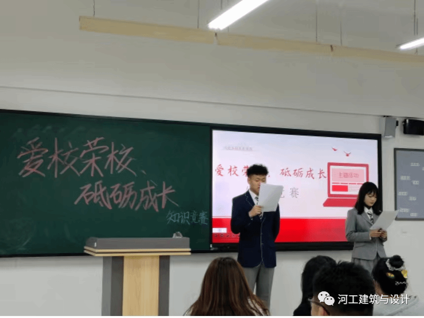 建筑与设计学院社团联合会于2023年3月24日下午18:00分别在主教418和407举办“爱校荣校,砥砺成长”知识竞赛活动,比赛分为初赛和决赛两个阶段,决赛在418举行。