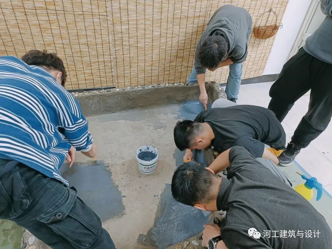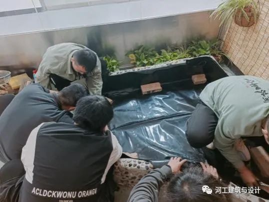 2023年3月17日,走进河工实训楼,在风景园林专业实验室内的师生难掩喜悦和激动的心情,以热烈的掌声庆祝建筑与设计学院风景园林专业“室内景观水池施工”开放性实验的圆满完成。