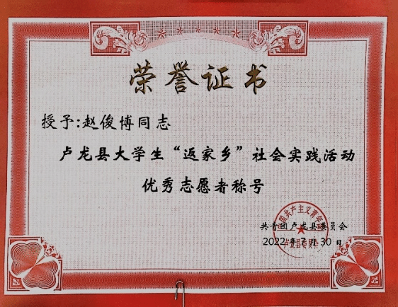 他说:通过这两次暑期“返家乡”社会实践,使我在书本上的理论走向实际,在实践中增长知识,锻炼自己的能力,更重要的是检验一下自己所学东西能否被社会所用,找出自己的不足之处,以便更好的取长补短,完成自己的学业。我也深刻体会到了开展大学生社会实践活动的内涵和必要性,它不仅组织大学生以深入社会实际,了解社会生活,参与社会实践锻炼为主要内容而且对于帮助大学生确立正确的政治方向,树立科学的世界观人生观和价值观,形成良好的道德品质起着重要的导向作用。今后,我也会积极参加学校和当地团委组织的各类活动,用自己所学专业知识为家乡做出贡献!