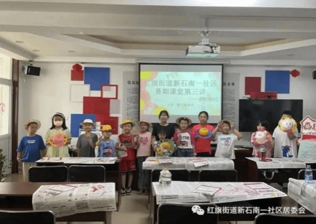 7月21日参加了红旗街道新石南–社区志愿服务(鸿润苑社区),负责美术教学等活动,在期间起到了组织策划和动员学生的作用,为了发散小朋友们的思维,用DIY的方式让小朋友们运用自己喜欢的颜色在图案上绘制成属于自己独特的“帽子”我感受到了社区人员的温暖与亲切。