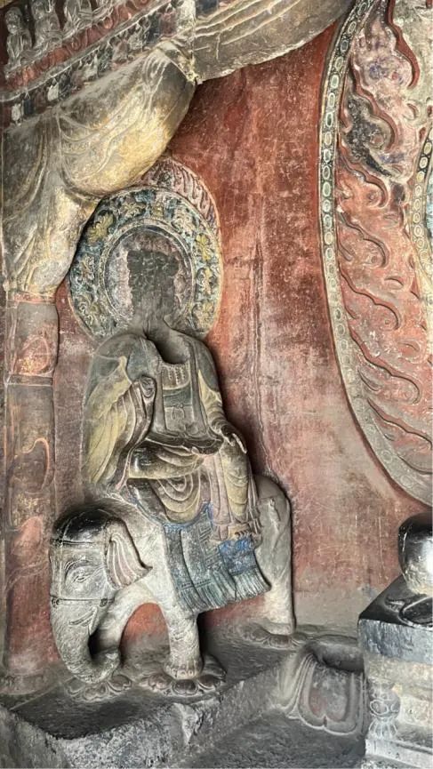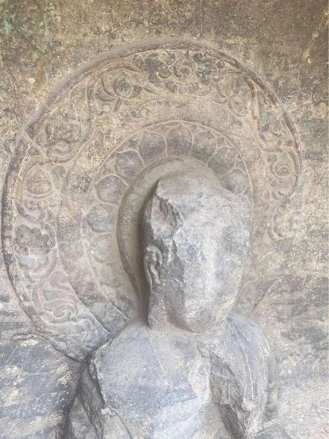 顶着烈日寻古,来到了石窟的北洞,当进入石窟的瞬问,极为震撼,北洞被称为“大佛洞”,是响堂山石窟群当中开凿最早的洞窟。大佛洞的设计融合了佛教宇宙观中独特的时间与空间观念。石窟入口处经过重修,入口上方是三个透光明窗,入口顶部还有类似覆钵顶的痕迹。洞窟内部设有大型的方形中心柱,柱上雕刻代表过去、现在和未来的三世佛,每尊佛两侧立有胁侍菩萨。国绕中心桂四周的石壁上和中心柱顶部刻开小龛,雕凿佛、菩萨和其他神祗,包括飞天和鬼神,这些高浮雕刀法精湛,刻画如生。石刻的造型工艺十分精妙,人物造像、光背火焰、以及由山花蕉叶、摩尼宝珠和装饰图案所围绕的覆钵顶塔形龛,体现了高超的雕刻技术水平。桑梓团队参观考察中及时记录了响堂山石窟中有特色的文化艺术元素,方便为后期设计文创产品提供灵感。通过此次调研考察,桑梓团队不仅收获了丰富的创作灵感,更能够切身体会佛教圣地信仰与艺术结合千年的结晶的魅力。