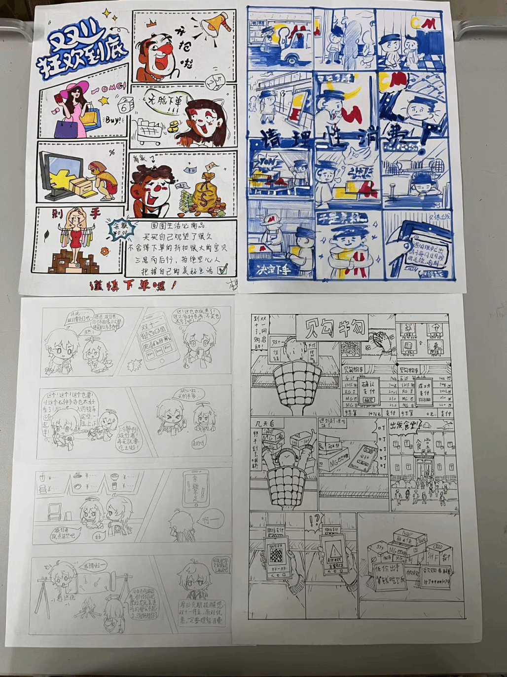 为了让当代大学生,用理性的眼光去看待购物,使同学们意识到过度消费的危害,让同学们不被一时的购物策略冲昏头脑,时刻保持清醒,货比三家,量力而行精挑细选,选择真正需要的物品,拒绝低效购买。建筑与设计学院创新创业特此举办“双十一·理性消费”手绘漫画比赛,以此呼吁广大同学树立正确的消费观念。