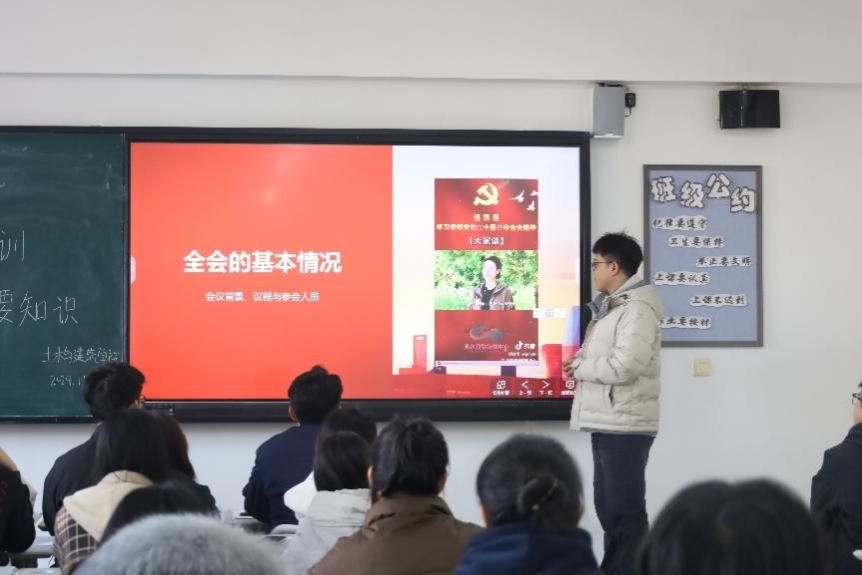 “逢山开路,遇水架桥”“艰难困苦,玉汝于成”“勇立潮头,奋勇搏击”,党的二十届三中全会再次传递出“改革不停顿、开放不止步”的鲜明信号,吹响了新起点上进一步全面深化改革的号角。2024年11月19日,今年会在主教501开展了“学习党的二十届三中全会重要知识”主题培训,主讲人为宋佳运同学。