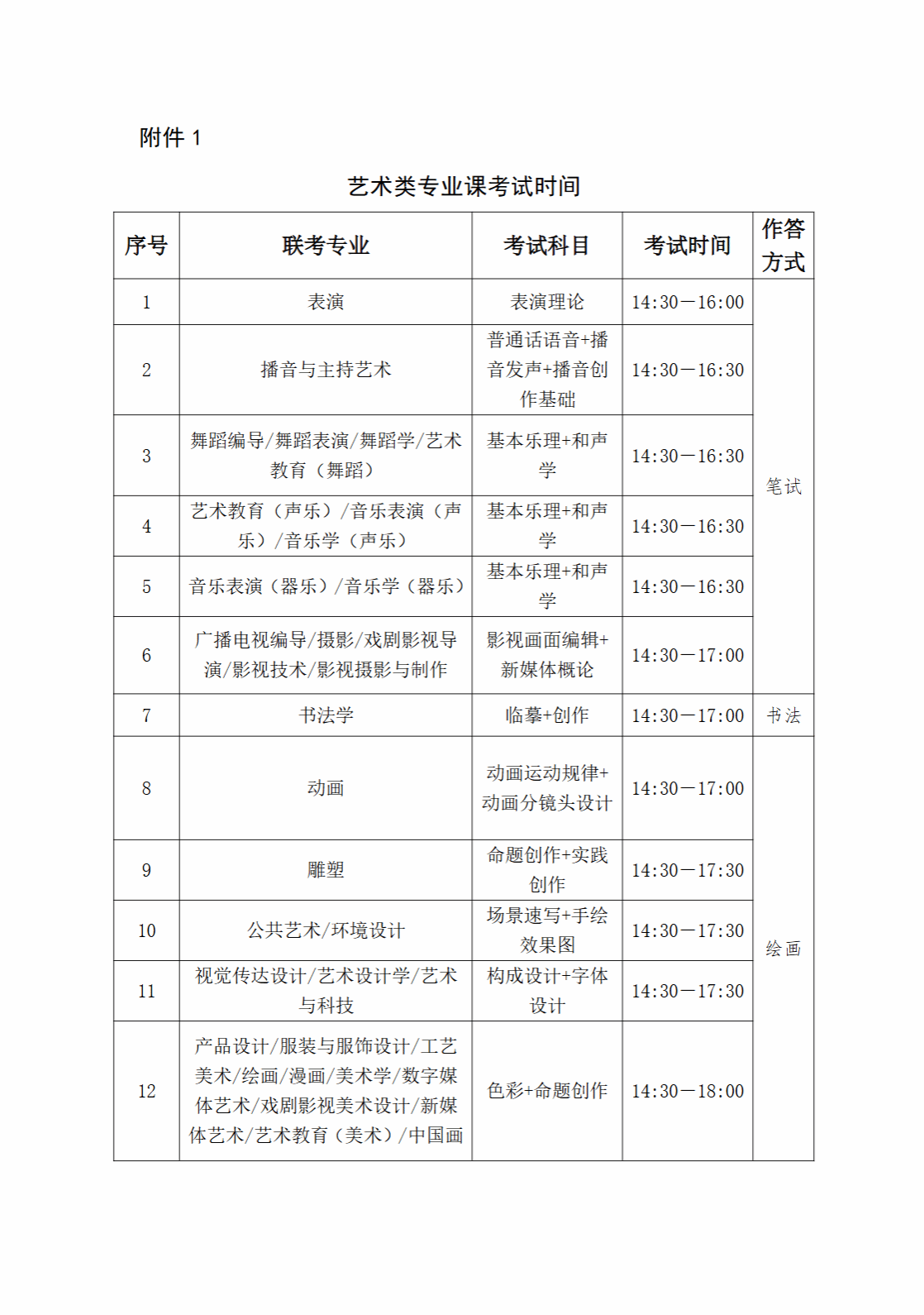 2.专业综合(职业适应性)考查:非艺术类专业考试时间为下午14:30-17:00;艺术类专业开考时间为下午14:30,结束时间详见《艺术类专业课考试时间》(附件1)。